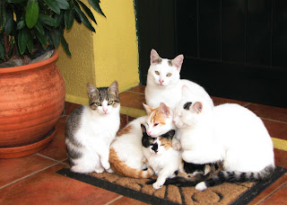 São seis. De duas mães. Com Oblomov, o pai, têm o pátio por conta. Apanham ratinhos e um ou outro pardal distraído, só para brincar, porque comida têm-na farta e boa, a hora certa, quatro vezes ao dia. E carinho, e pírulas para que as pulgas, vermes e ácaros os não aflijam. São da rua, mas parecem gatos de anúncio e como tal se comportam.